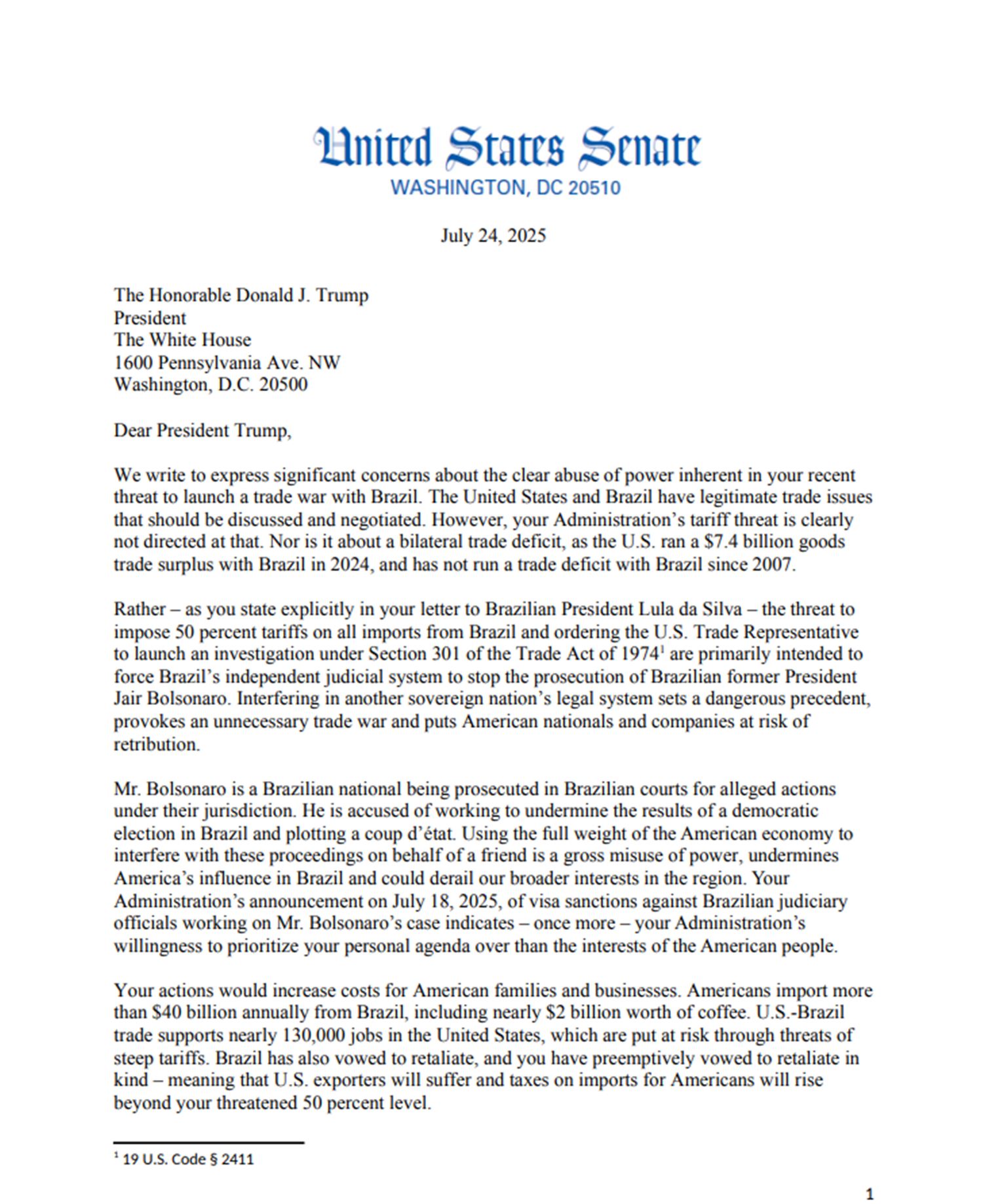 Segundo a carta, “utilizar o peso total da economia americana para interferir nesses processos em nome de um amigo representa um grave abuso de poder, enfraquece a influência americana no Brasil e pode prejudicar nossos interesses mais amplos na região”.