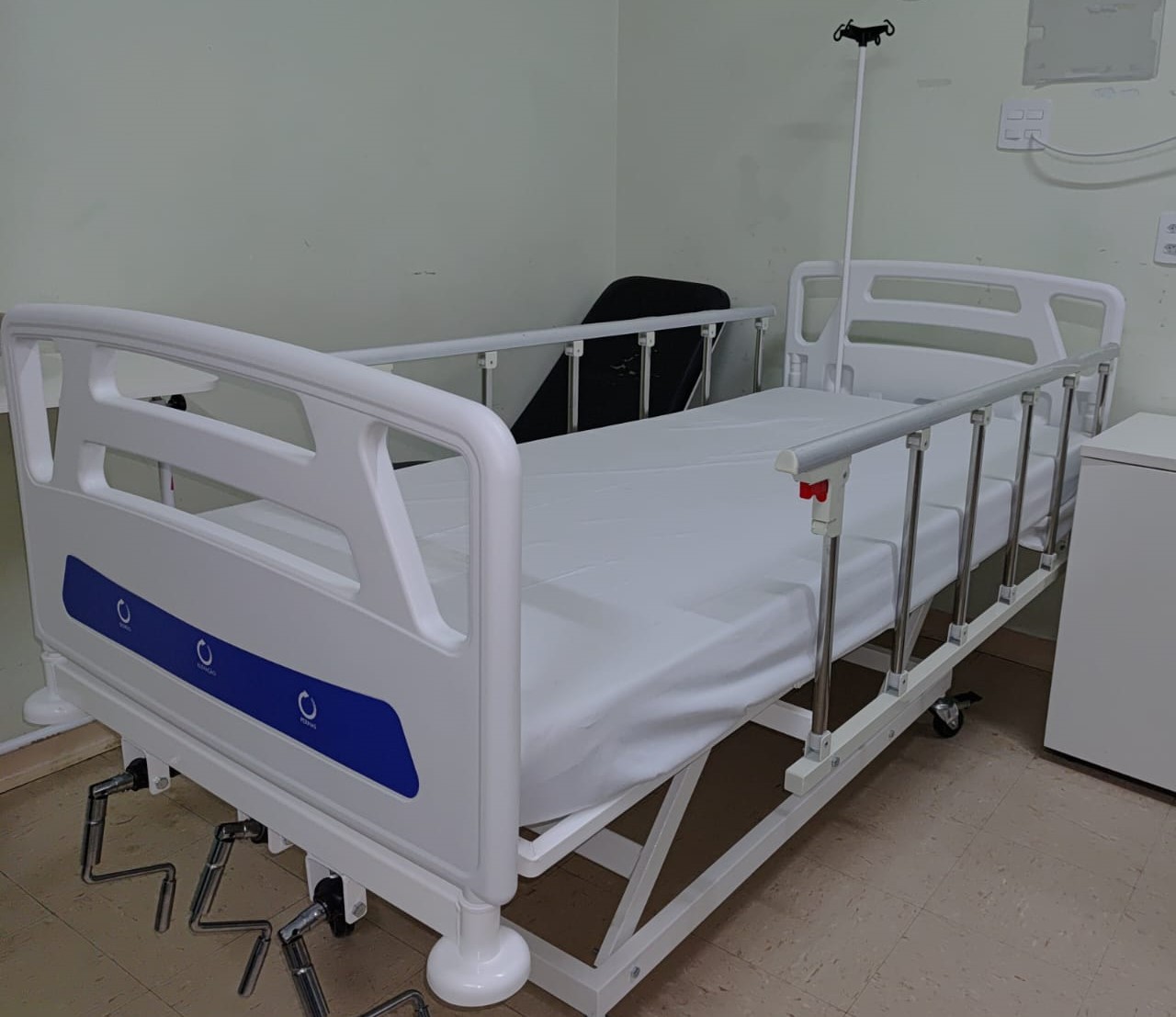 Esse tipo de cama conta também com recursos como cabeceira removível e grades laterais para prevenir quedas. Possui quatro rodas giratórios com freios na diagonal, que garantem segurança ao paciente e deslocamento fácil ao profissional de saúde, além de suporte de soro e colchão densidade 33, ideal para acomodação hospitalar.