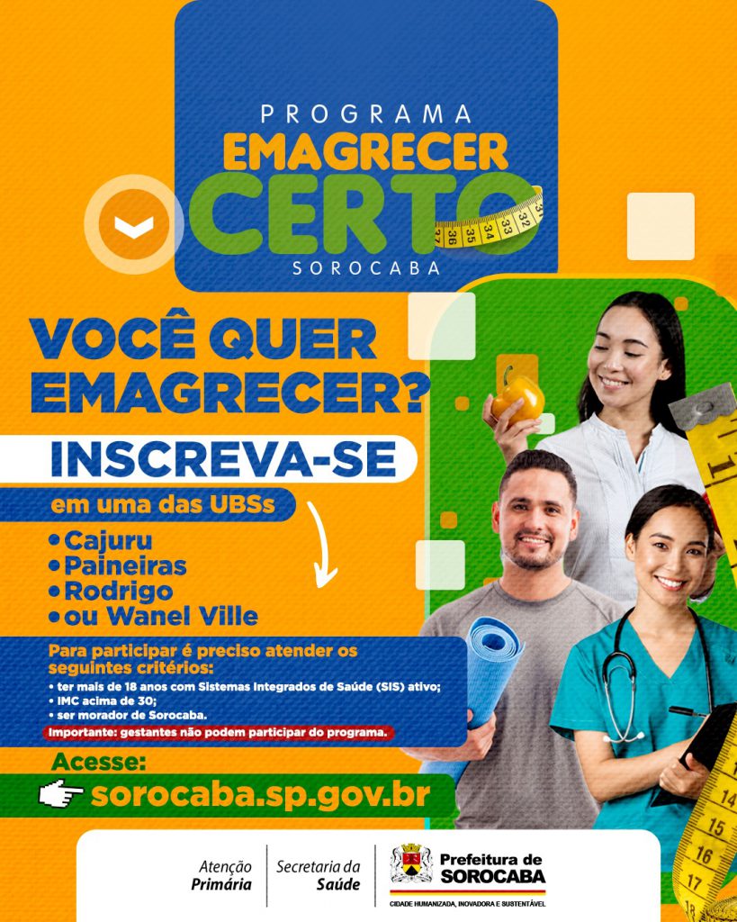 O programa “Emagrecer Certo Sorocaba” terá duração de aproximadamente 6 meses e contará com acompanhamento multiprofissional, que auxilia na promoção de autocuidado, melhora na qualidade de vida e redução de peso corporal.
