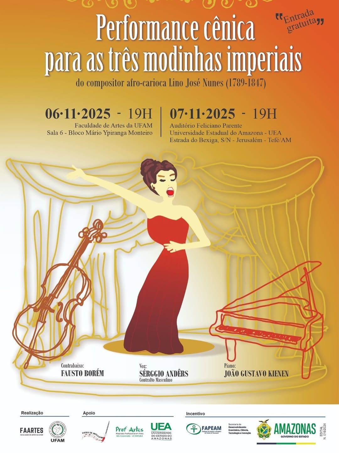 Promover a Música Imperial Brasileira é o objetivo do evento ‘Performance cênica para as três Modinhas Imperiais do compositor afro-carioca Lino José Nunes (1789-1847)’. A apresentação tem o apoio do Governo do Amazonas, por meio da Fundação de Amparo à Pesquisa do Estado do Amazonas (Fapeam), via Programa de Apoio à Participação em Exposições Inovadoras Técnico-Científicas e Artísticas (Ciência +Art). O espetáculo será realizado nos municípios de Manaus e Tefé (a 523 km da capital) nos dias 6 e 7 de novembro.