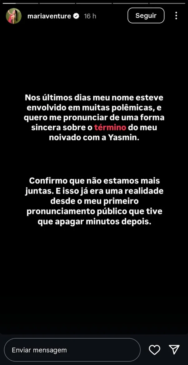 Noiva de Yasmin Santos, Maria Venture anuncia fim do relacionamento