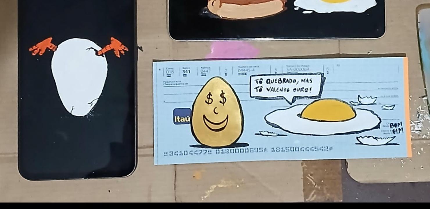 Celulares quebrados, latas de tintas vazias, madeiras cortadas, cheques não preenchidos, cartões de banco bloqueados e outras mídias são transformadas em arte por Bomfim. Em ‘Quem veio Primeiro?’, o artista mantém o seu traçado e discurso bem humorado, além de colocar uma pitada de saudade da sua terra.