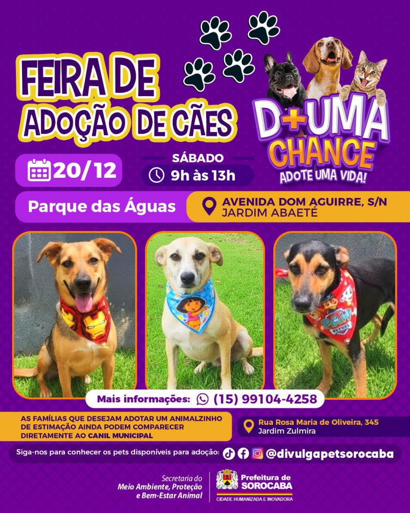A Prefeitura de Sorocaba, por meio da Secretaria do Meio Ambiente, Proteção e Bem-Estar Animal (Sema), realiza neste sábado (20), das 9h às 13h, a feirinha de adoção de cães no Parque das Águas, Jardim Abaeté.