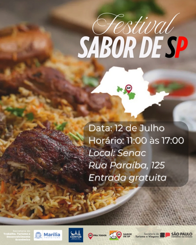 No sábado, dia 12, a partir das 11h, moradores de Marília e arredores poderão explorar a rica gastronomia da região no Festival Gastronômico Sabor de São Paulo, que ocorre na sede do Senac da cidade. Com entrada gratuita, o evento faz parte da segunda temporada do Sabor de São Paulo, o maior programa de valorização da gastronomia paulista, promovido pela Secretaria de Turismo e Viagens do Estado de São Paulo (Setur-SP), em parceria com o Mundo Mesa e o Senac-SP. O festival reúne produtores e estabelecimentos da