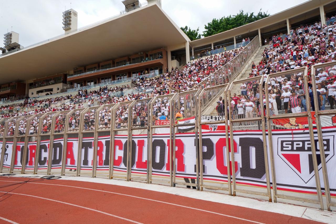 Entre as dezenas de faixas espalhadas ao redor do gramado estava a da Torcida Tricolor PCD, criada para promover a inclusão e acessibilidade de pessoas com deficiência nos estádios.