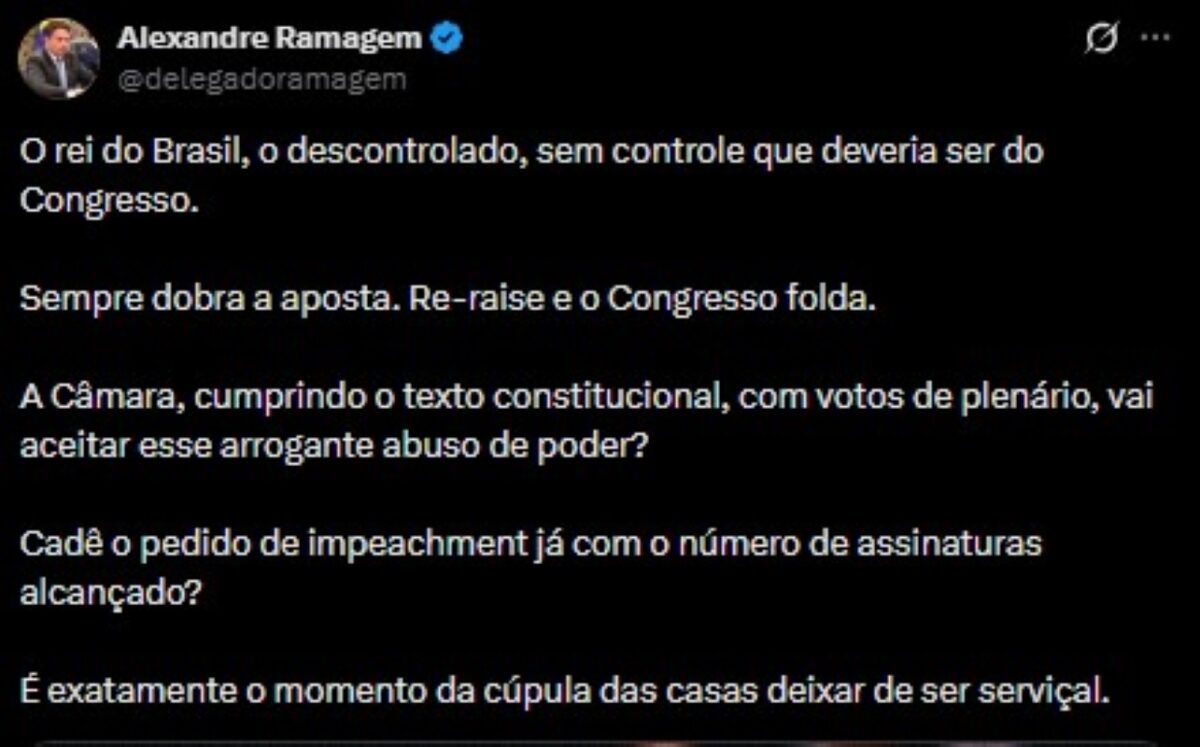 “O rei do Brasil, o descontrolado, sem controle que deveria ser do Congresso. Sempre dobra a aposta. Re-raise e o Congresso folda. A Câmara, cumprindo o texto constitucional, com votos de plenário, vai aceitar esse arrogante abuso de poder? Cadê o pedido de impeachment já com o número de assinaturas alcançado? É exatamente o momento da cúpula das casas deixar de ser serviçal”, escreveu Ramagem.