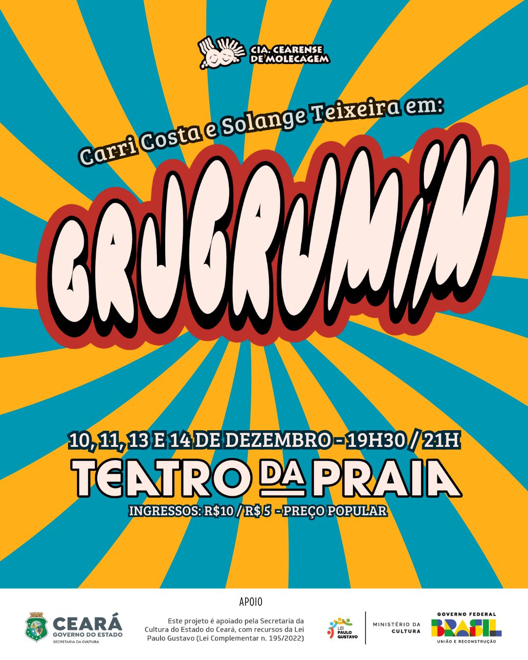 O velho Circo Peneirão nunca esteve tão perto de ruir — e não por intempéries, concorrência ou falta de público, mas por um “grugumim” que se infiltrou no juízo de suas figuras centrais. É nesse estado de delírio e desarranjo poético que Carri Costa ambienta seu novo espetáculo, Grugumim, produção da Associação dos Produtores Teatrais do Ceará, que estreia no Teatro da Praia, em Fortaleza, para investigar, com humor afiado e linguagem contemporânea, a crise dos artistas tradicionais diante da era da hiperexposição digital.