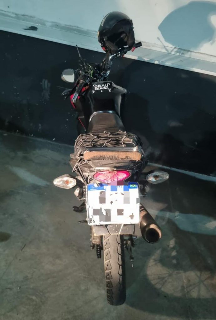 O suspeito informou que a motocicleta não possuía documentação, motivo pelo qual tentou evadir-se, para evitar a apreensão do veículo. Informou também que comercializa peças de motocicletas on-line e que as armazenava em sua residência.