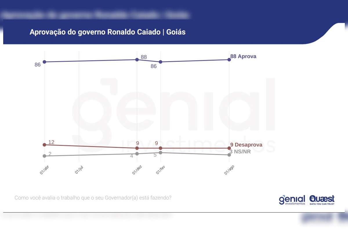O governador de Goiás, Ronaldo Caiado (União), é aprovado por 88% da população. O número foi apurado pela pesquisa Genial Quaest, divulgada nesta sexta-feira (22/8). A desaprovação do governador, que está no segundo mandato, é de 9%. Houve 3% que não souberam opinar ou não responderam.