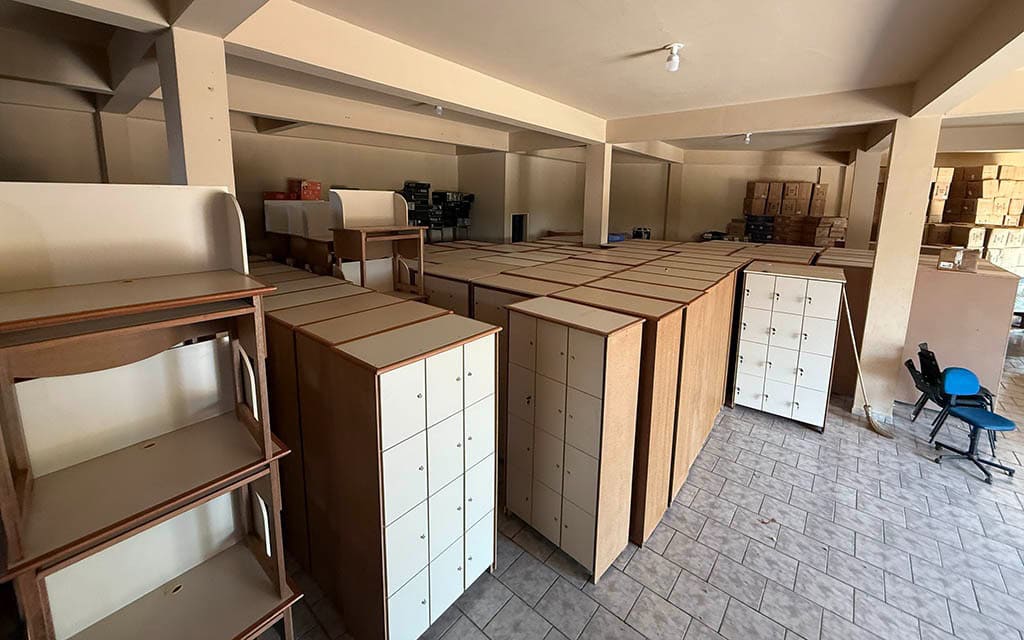 Entre os itens adquiridos estão armários escaninhos, mesas para computador, conjuntos do professor, cadeiras universitárias, mesas de trabalho, armários altos, bancadas para computador e poltronas.