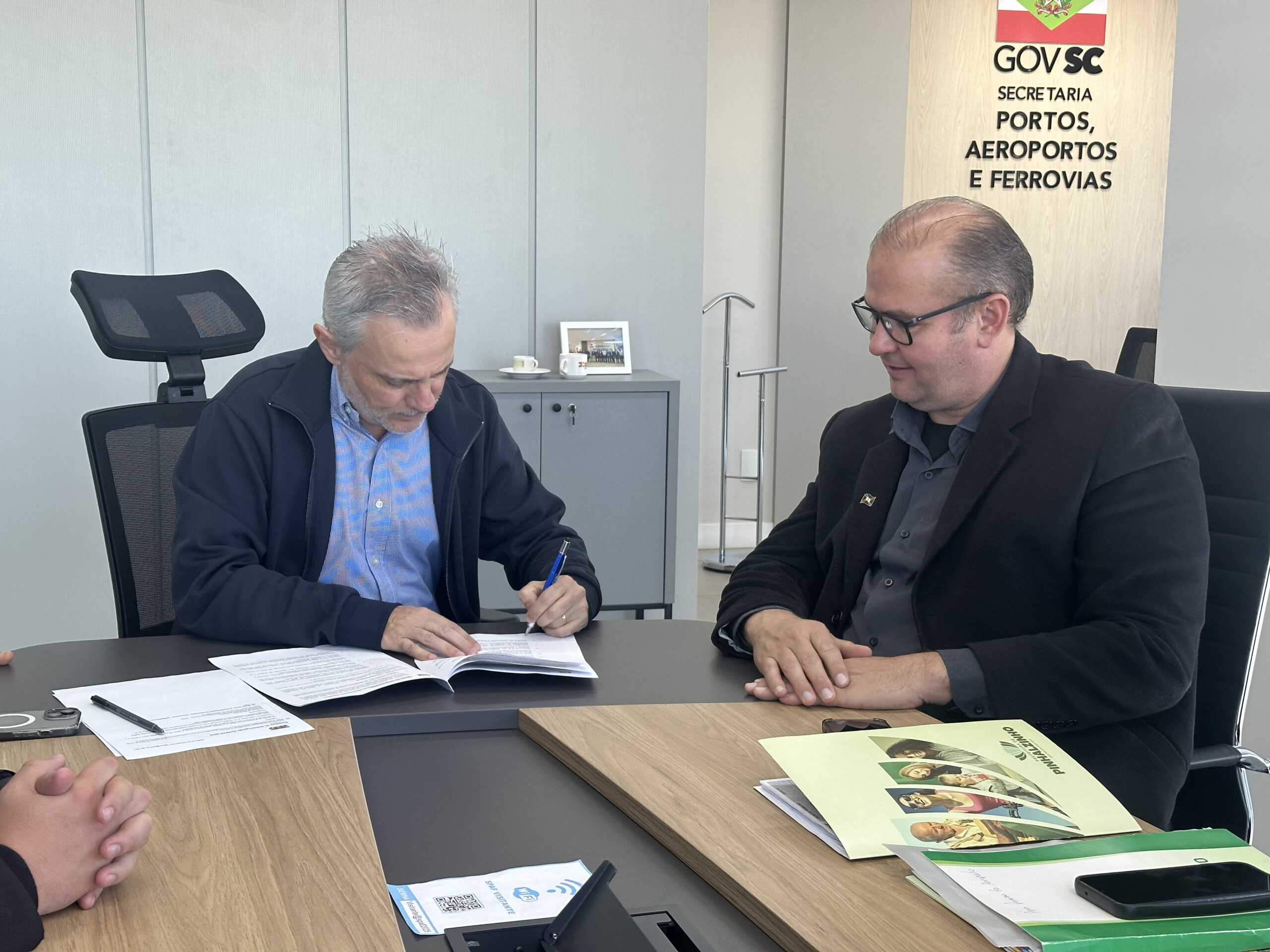 O secretário de Portos, Aeroportos e Ferrovias (SPAF), Beto Martins e o prefeito de Pinhalzinho, Alessandro Beltrame, estiveram reunidos para debater os próximos passos para as obras do Aeroporto do município. A ideia é que a ordem de serviço seja assinada pela prefeitura nos próximos 60 dias. O encontro também teve a participação de vereadores do município. O investimento do Governo do Estado é de R$ 8 milhões.