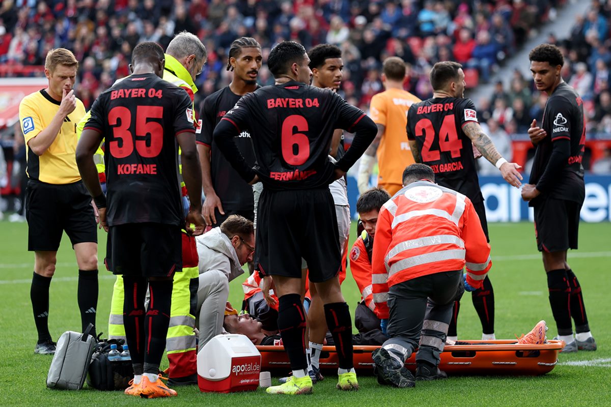 Grimaldo assustou os torcedores do Bayer Leverkusen neste sábado (4/10). O lateral-esquerdo levou cotovelada do companheiro Kofane, que atua na zaga, e caiu com um corte profundo no rosto.