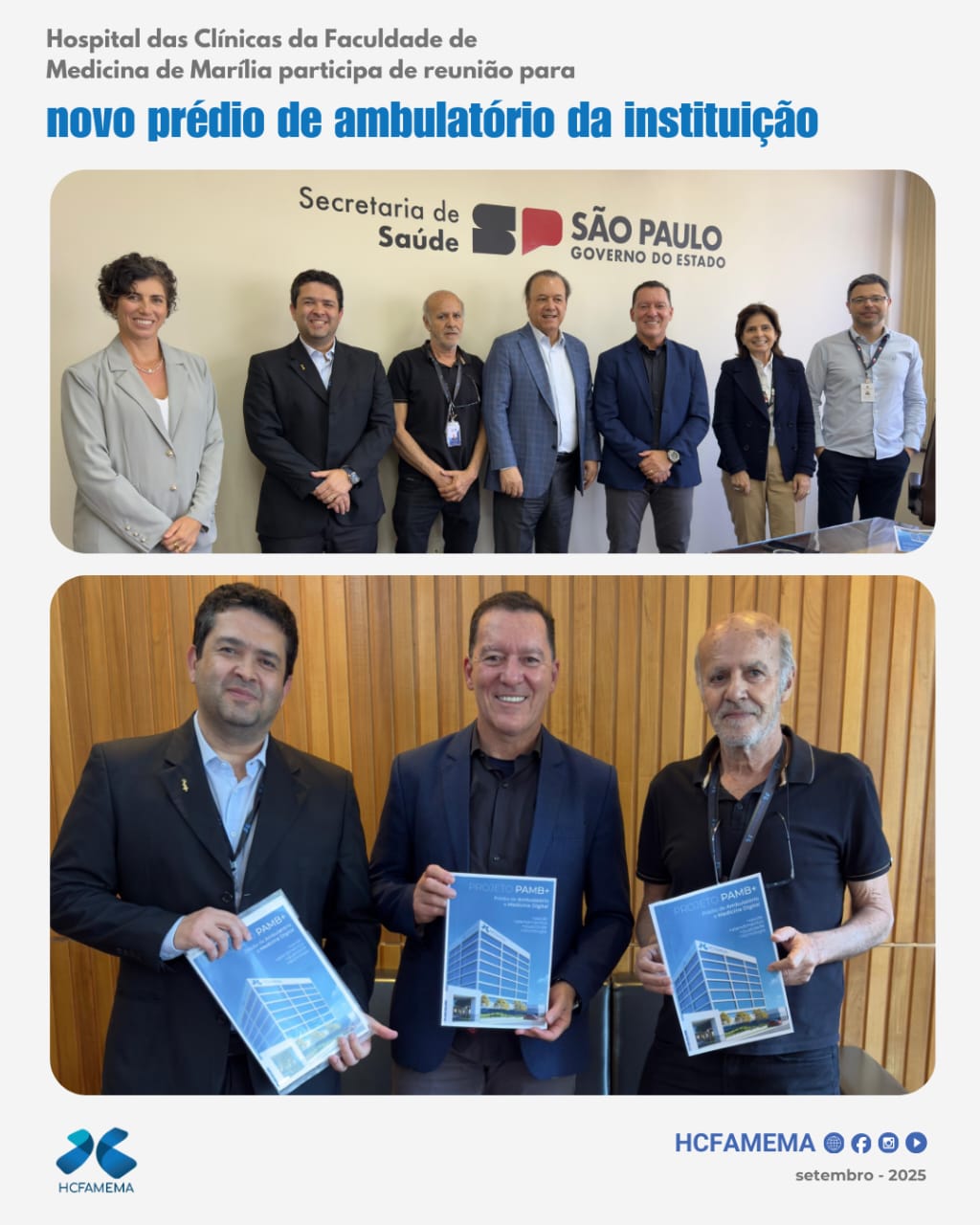 O Hospital das Clínicas da Faculdade de Medicina de Marília (HCFAMEMA) esteve presente na sede da Secretaria Estadual de Saúde de São Paulo (SES/SP) hoje, 29 de setembro de 2025, para uma reunião sobre o Prédio Ambulatório e Medicina Digital (PAMB+).