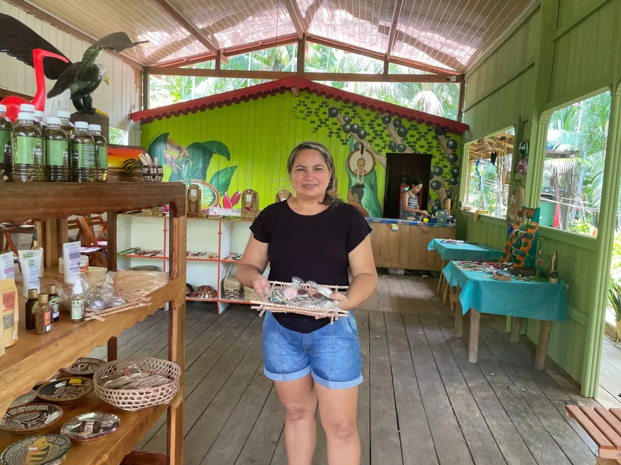 Quem também sente os efeitos das mudanças climáticas é Iracema dos Santos, 41 anos. Junto do marido, Charles Teles, 47, ela mantém o Igara Artesanal, um espaço cultural onde recebe turistas para vivências ribeirinhas — como a do açaí e do camarão — e trilhas ecológicas pela mata. Mas há três anos a atividade ligada ao camarão foi suspensa.