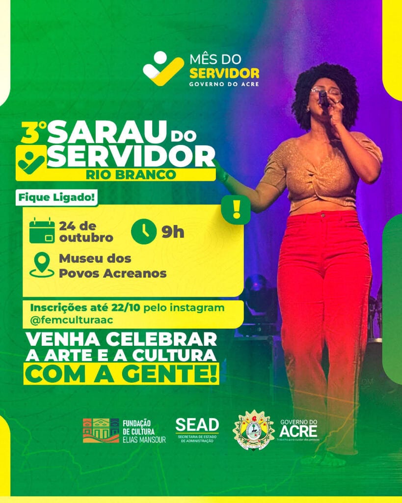 Estão abertas as inscrições para o Sarau do Servidor 2025, evento que celebra a criatividade e o talento dos servidores públicos do Acre. Promovido pelo governo do Acre, por meio da Secretaria de Estado de Administração (Sead) e com coordenação da Fundação de Cultura Elias Mansour (FEM), o sarau integra a programação em homenagem ao Dia do Servidor Público, comemorado em 28 de outubro.