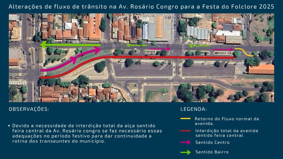 Haverá interdição total da Avenida Rosário Congro, no trecho da pista sentido centro para a Avenida Ranulpho Marques Leal, abrangendo o cruzamento com a Avenida Clodoaldo Garcia até a Rua João Carrato.
