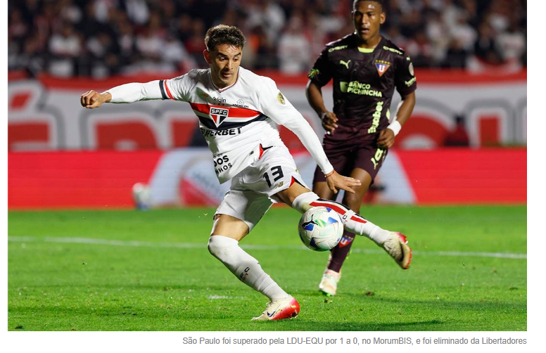 O São Paulo está fora da Libertadores. Em mais uma atuação abaixo do esperado, o Tricolor foi derrotado novamente pela LDU, desta vez no Morumbis, e deu adeus ao sonho do tetracampeonato continental. A eliminação veio com gosto amargo e clima de frustração total.