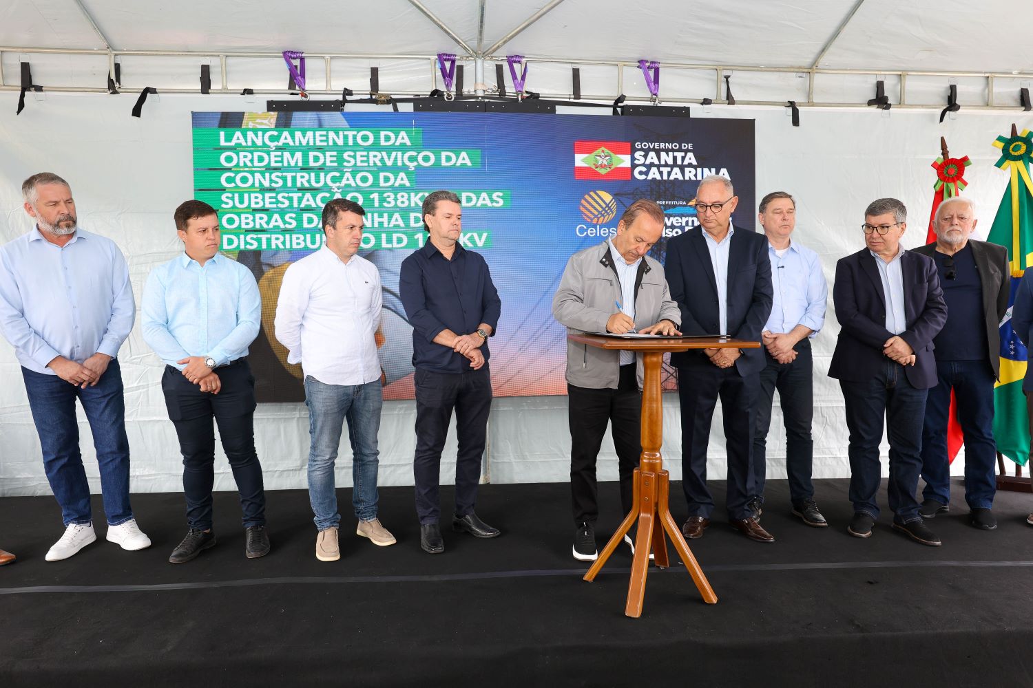 O governador Jorginho Mello assinou neste sábado, 27, a ordem de serviço para o início das obras da nova subestação, Linha de Distribuição (LD) e redes alimentadoras em Governador Celso Ramos, na Grande Florianópolis. A melhoria na rede de energia elétrica é uma ação do Governo do Estado por meio da Celesc