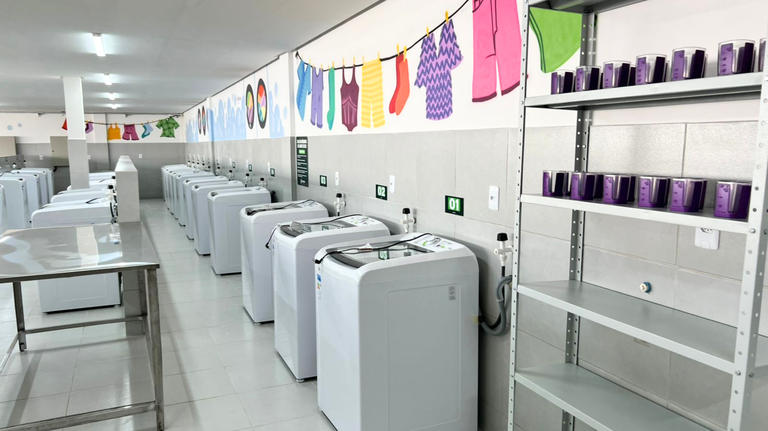 Com máquinas de alta eficiência, as lavanderias também reduzem o consumo de água e energia e promovem reúso de recursos, reduzindo o impacto ambiental. Além disso, reduzem os gastos dos domicílios com contas de água e energia. Enquanto as roupas são lavadas, mulheres podem participar de oficinas e formações, com filhos acolhidos na brinquedoteca, e homens e jovens são convidados a participar das atividades, desconstruindo a ideia de que lavar roupa é “trabalho de mulher”. O objetivo é estimular o compartilhamento das responsabilidades de cuidado no âmbito familiar e comunitário, ampliando as possibilidades de participação social e econômica das mulheres.