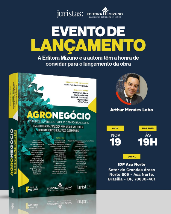O livro Agronegócio – estudos jurídicos para o campo (Editora Mizuno) será lançado em Brasília no dia 19 de novembro, às 19h, no Instituto Brasileiro de Ensino, Desenvolvimento e Pesquisa (IDP), na Asa Norte. Com mais de 600 páginas, o conteúdo sem juridiquês reúne artigos e estudos de juristas, pesquisadores e profissionais do mercado, abordando […]