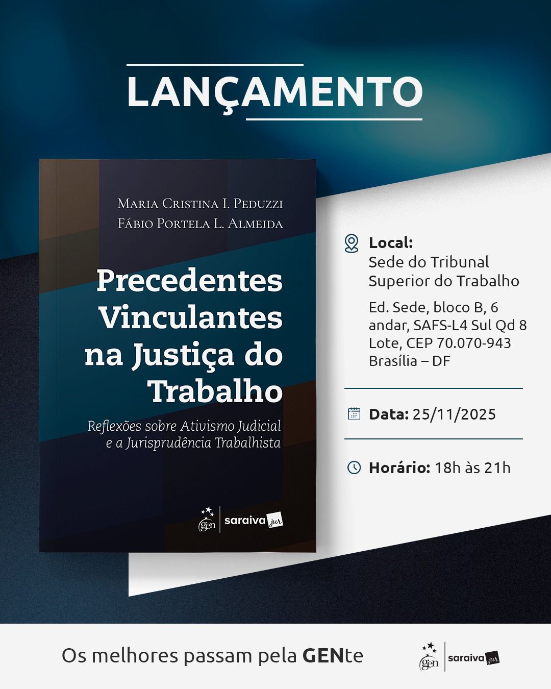 O livro Precedentes vinculantes na Justiça do Trabalho – reflexões sobre ativismo judicial e a jurisprudência trabalhista (Gen/Saraiva), da ministra do Tribunal Superior do Trabalho Maria Cristina Peduzzi e seu assessor Fábio Portela Lopes de Almeida, será lançado na próxima terça-feira (25/11), em Brasília. O evento ocorrerá das 18h às 21h na sede do TST. […]