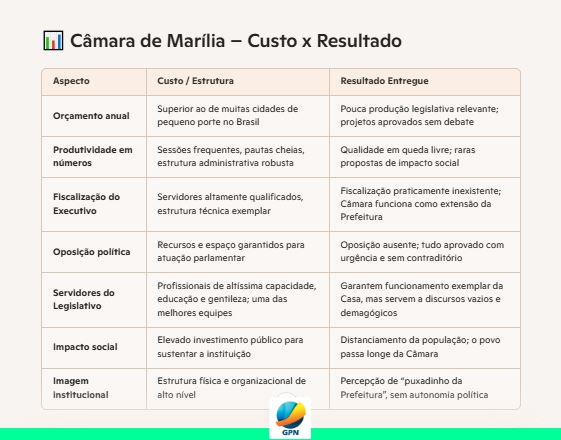 A Câmara Municipal de Marília, uma das mais estruturadas do interior paulista, apresenta um retrato preocupante: investimento público elevado, estrutura técnica de excelência, mas resultados políticos pífios. A tabela “Custo x Resultado”, divulgada por fontes internas, escancara a distância entre o que se gasta e o que se entrega à sociedade.