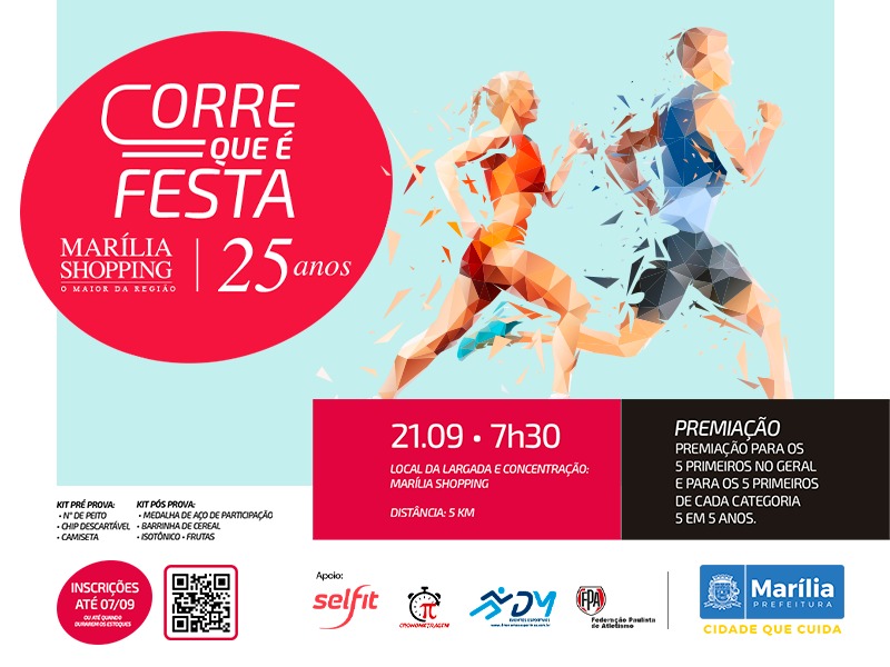 Como parte da programação comemorativa pelos seus 25 anos de atuação, o Marília Shopping realiza no dia 21 de setembro, a corrida de rua “Corre que é Festa”. O evento é uma oportunidade para reunir a comunidade em torno de um propósito saudável e solidário, incentivando a prática esportiva como forma de celebrar essa trajetória.