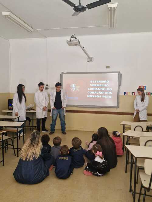 Outra frente de atuação foi o Setembro Vermelho Pet, campanha dedicada à conscientização sobre doenças cardiovasculares em cães e gatos. A ação foi realizada em diferentes pontos da cidade, incluindo escolas e semáforos, onde estudantes conversaram com moradores e distribuíram orientações sobre sinais, prevenção e importância do acompanhamento veterinário.