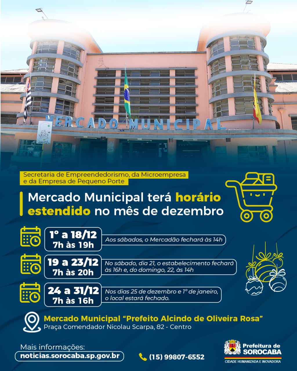 Devido a tradicional programação de Fim de Ano no Centro de Sorocaba, o Mercado Municipal “Prefeito Alcindo de Oliveira Rosa” terá horário estendido no mês de dezembro. Entre os dias 1º e 18, de segunda a sexta-feira, o local funcionará das 7h às 19h. Já aos sábados, o Mercadão fechará às 14h.