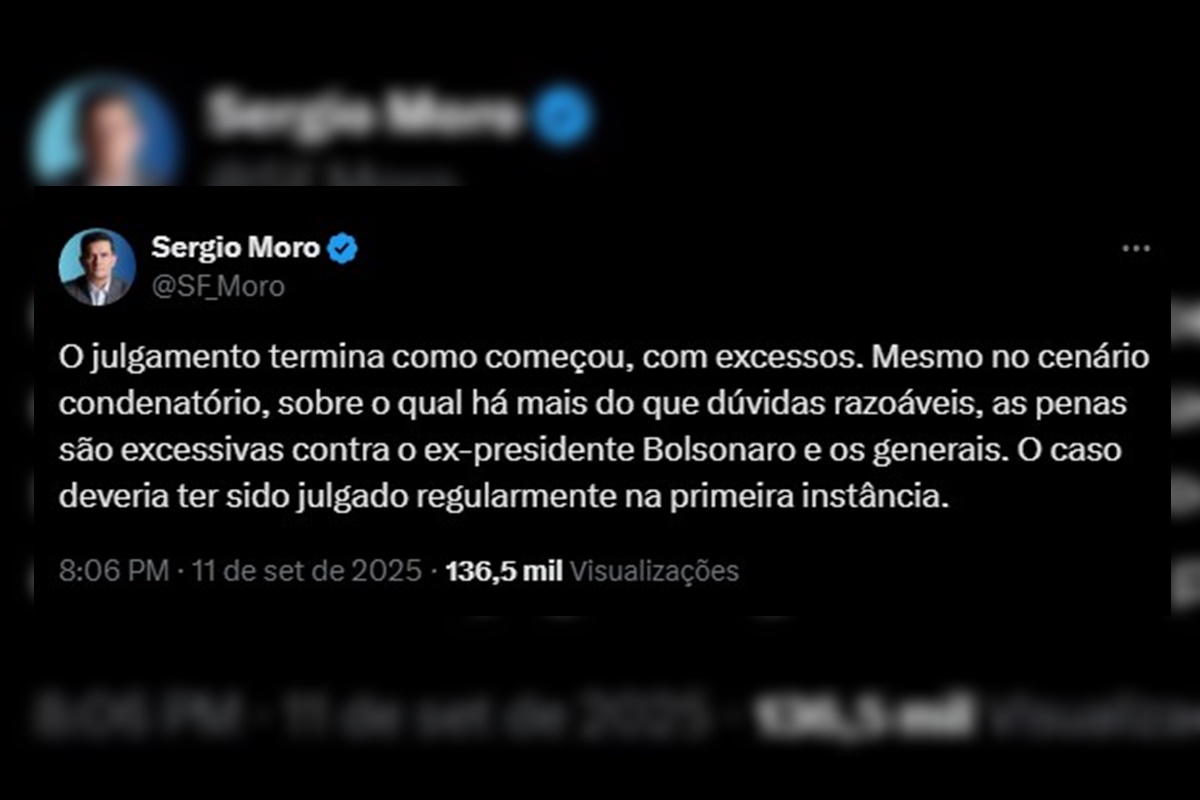 O senador da República Sergio Moro (União-PR) afirmou, nessa quinta-feira (11/9), que o julgamento do ex-presidente Jair Bolsonaro (PL) por tentativa de golpe de Estado, realizado pela Primeira Turma do Supremo Tribunal Federal (STF), foi marcado por “excessos”, mesma palavra que ele utilizou para definir as penas aplicadas ao ex-presidente e aos outros sete réus também condenados.