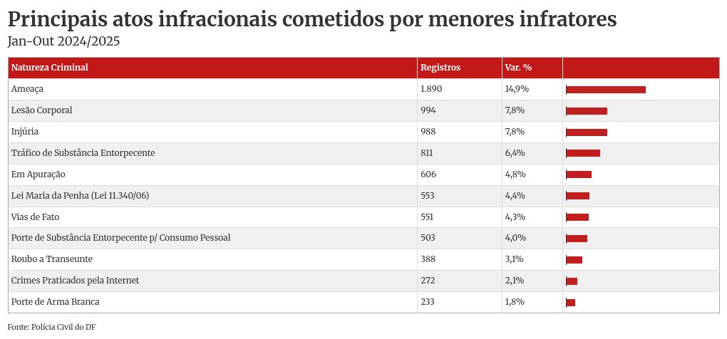 Dados obtidos pelo Metrópoles revelam que, nos 10 primeiros meses deste ano, 2.715 menores infratores foram apreendidos pela Polícia Civil do Distrito Federal (PCDF). Desses, mais de 75% foram detidos em flagrante.
