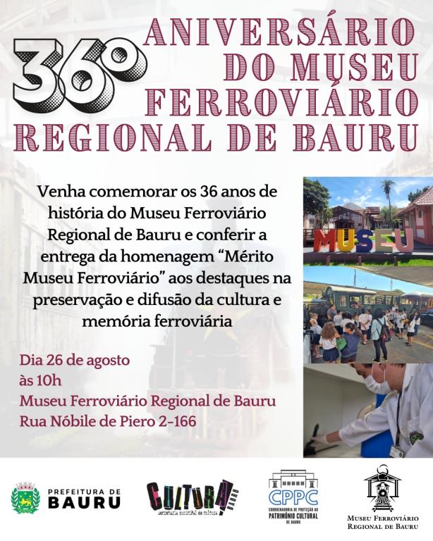 A Prefeitura de Bauru, por meio da Secretaria de Cultura, celebra o 36º aniversário do Museu Ferroviário Regional com o evento ‘Mérito Museu Ferroviário Regional de Bauru’, promovido pela equipe da Coordenadoria de Políticas Públicas de Preservação ao Patrimônio Cultural e Museus de Bauru. A homenagem acontece nesta terça-feira (26), a partir das 10h, e tem como objetivo reconhecer pessoas que se destacaram na preservação e difusão do Patrimônio Cultural Industrial Ferroviário da cidade.