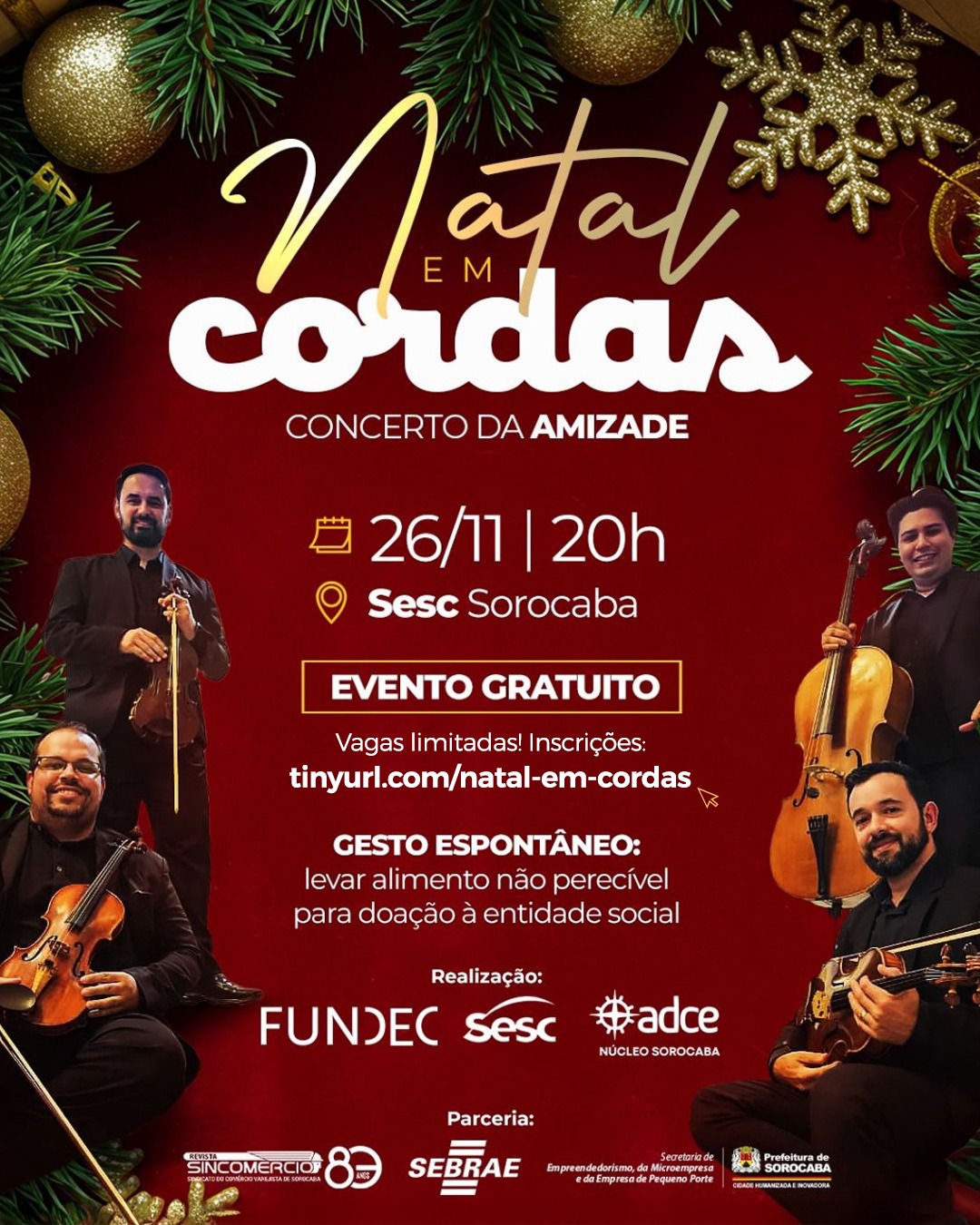 O espírito natalino vai tomar conta do Sesc Sorocaba na próxima quarta-feira (26), às 20h, com o espetáculo “Natal em Cordas – Concerto da Amizade”, apresentado pelo Quarteto de Cordas Fundec. A apresentação promete emocionar o público com uma seleção especial de músicas que celebram a amizade, a solidariedade e a magia do Natal.