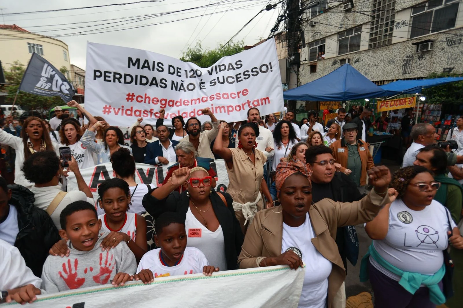 Durante o percurso, moradores estenderam faixas com frases como “Fora Cláudio Castro. Chega de matança nas favelas”, em referência ao governador do estado, Cláudio Castro, do PL. Também havia cartazes com dizeres “Morador não é criminoso” e “Mais de 120 vidas perdidas não é sucesso”.