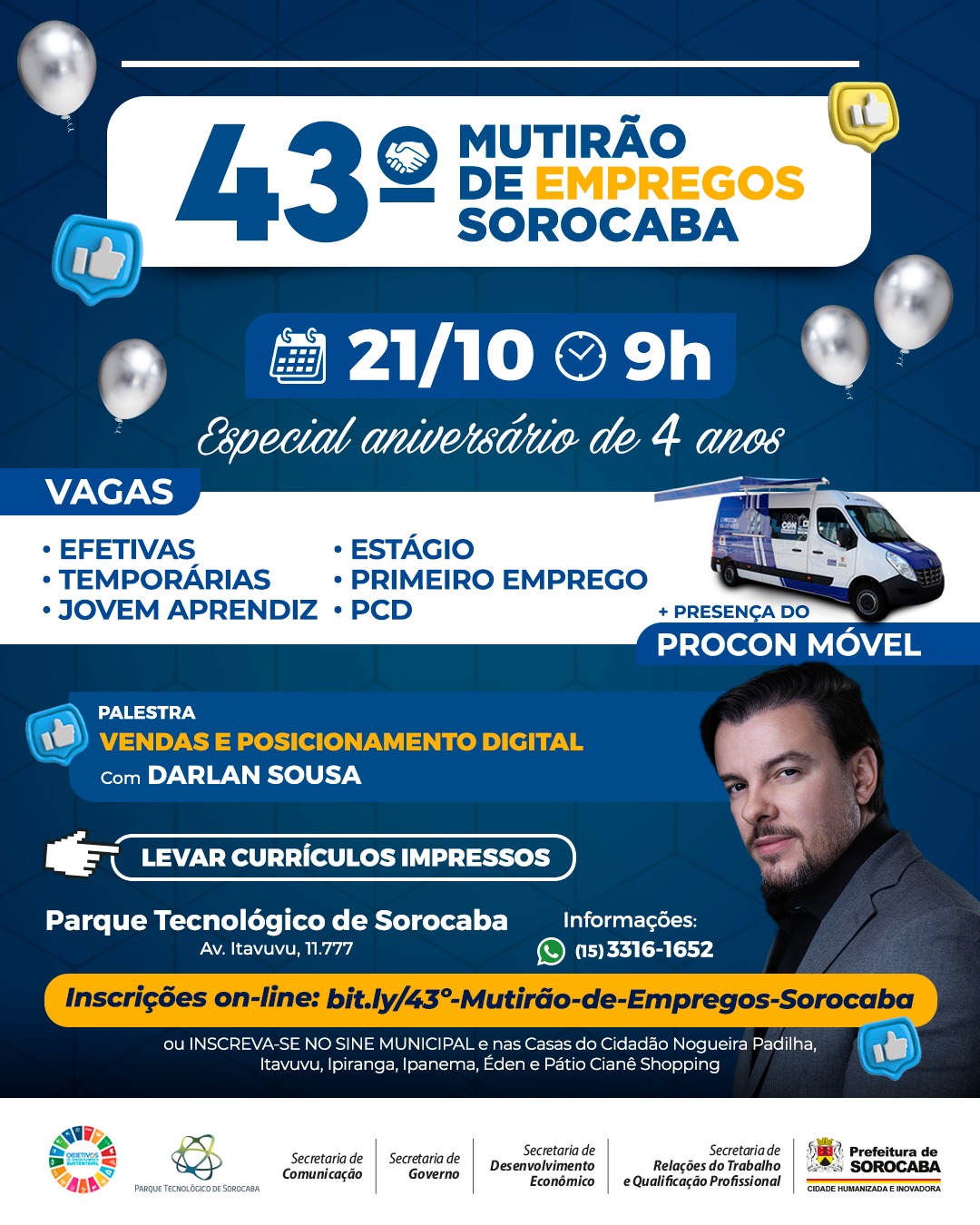 O Mutirão de Empregos Sorocaba – Edição especial de aniversário de 4 anos, segue com as inscrições abertas e a população presente terá a oportunidade de participar da palestra “Vendas e Posicionamento Digital” com o empresário Darlan Sousa. O evento acontecerá no dia 21 de outubro, às 9h, no Parque Tecnológico de Sorocaba (PTS).