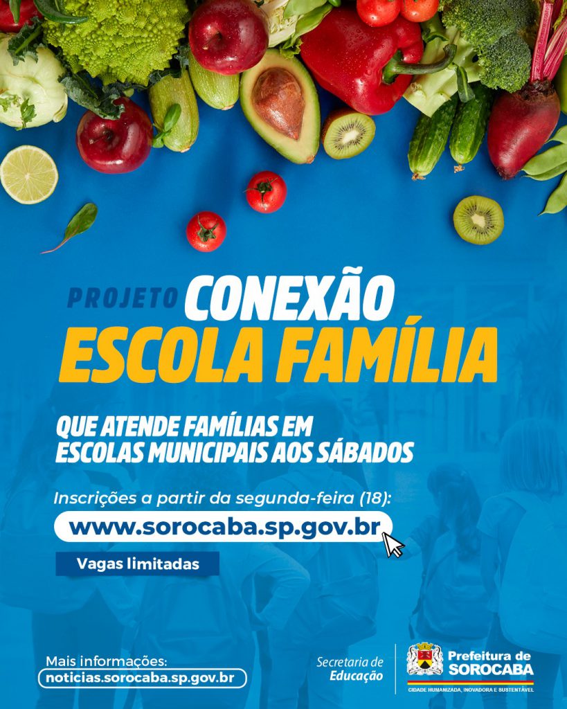 O projeto “Conexão Escola Família” não atenderá neste sábado (16), em razão do feriado municipal que celebra o aniversário da cidade (15 de agosto), mas retornará já na próxima semana. Assim, as famílias interessadas em participar poderão realizar as inscrições, que estarão disponíveis a partir da próxima segunda-feira (18) para participar do projeto, no sábado seguinte (23), no período das 10h às 13h, em quatro escolas municipais. As inscrições serão pelo link: http://escola-familia.sorocaba.sp.gov.br/conefam/inscricoes/. Para garantir a participação, o formulário deve ser completamente preenchido, até que a mensagem de confirmação da inscrição apareça na tela. As vagas são limitadas e disponibilizadas semanalmente.