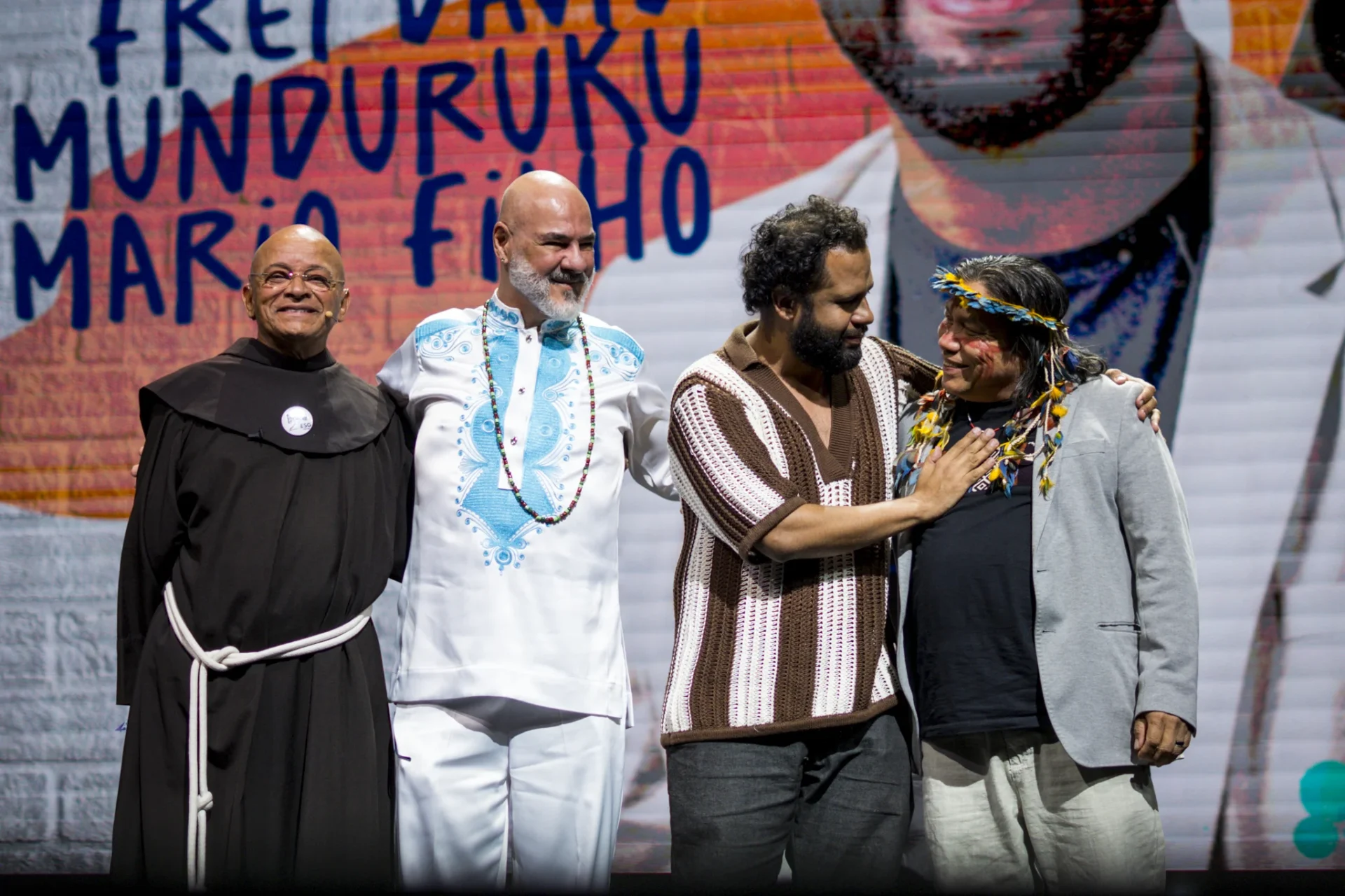 Daniel Munduruku emocionou ao citar Gonzaguinha e refletir sobre a infância como semente do futuro. “Precisamos de afeto para afetar as pessoas e construir uma revolução silenciosa”, disse.