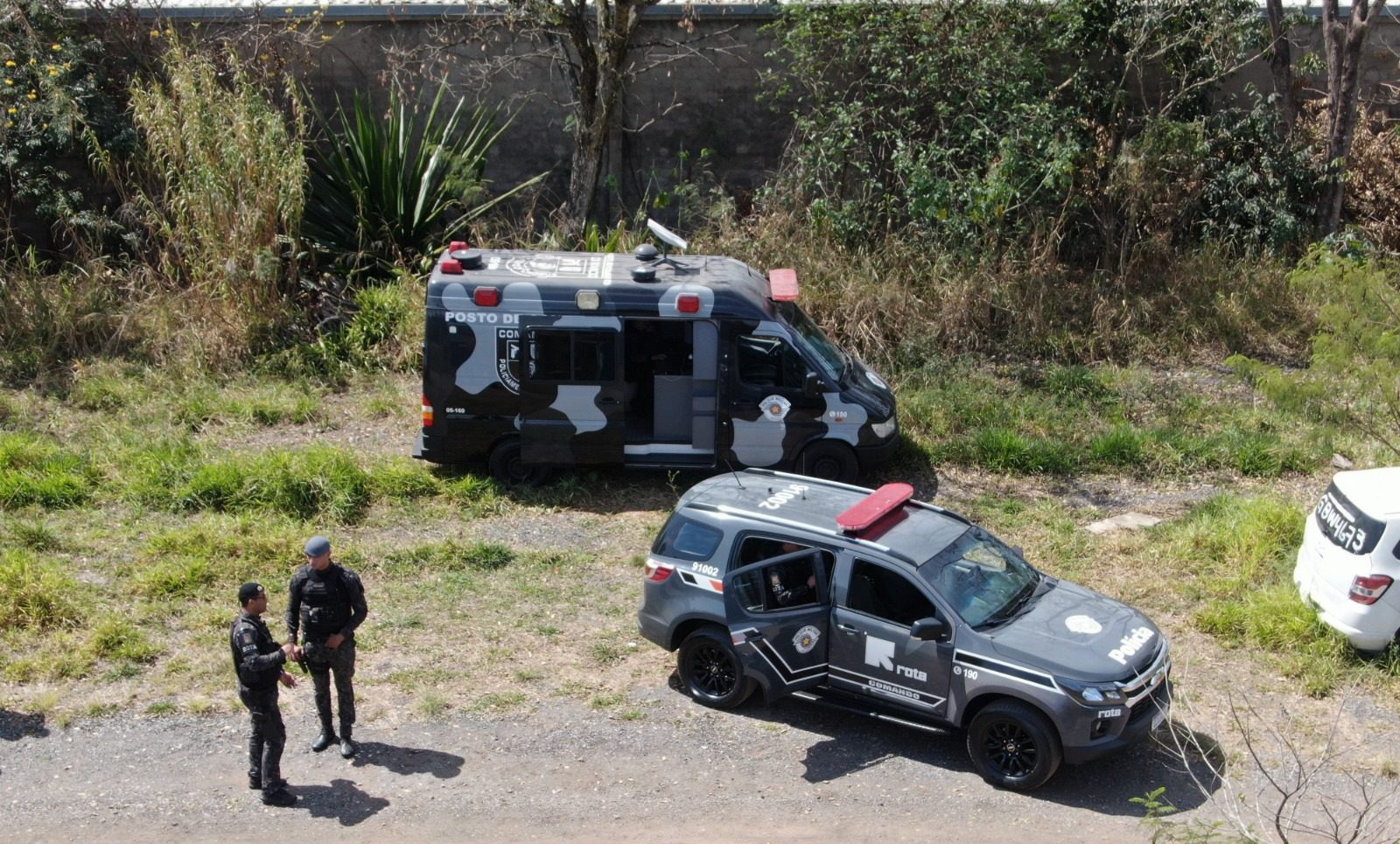 Para a ação, foram empenhados 129 policiais da Rota e do Canil. Equipes do Centro de Inteligência da Polícia Militar (CIPM) também prestam apoio com levantamento de informações sobre possíveis endereços de foragidos da Justiça. Drones são utilizados para fazer a varredura da região.