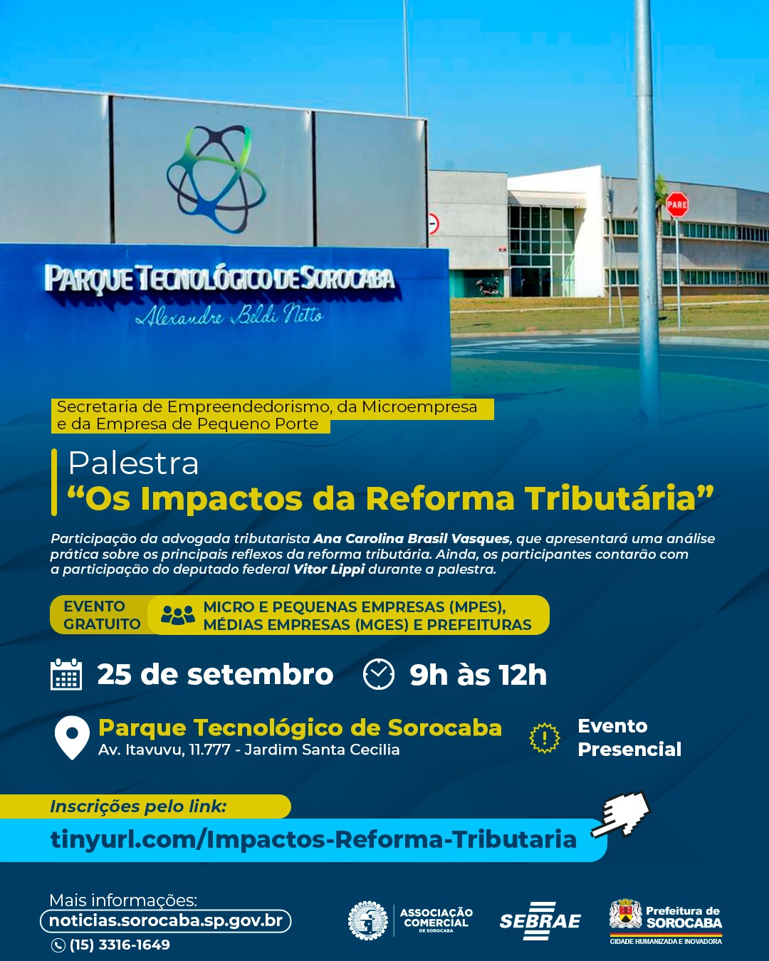 A Prefeitura de Sorocaba, por meio da Secretaria de Empreendedorismo, da Microempresa e da Empresa de Pequeno Porte (Semepp), junto ao Serviço Brasileiro de Apoio às Micro e Pequenas Empresas (Sebrae) e a Associação Comercial de Sorocaba (ACSO), realizarão, na quinta-feira (25), às 9h, a palestra “Os Impactos da Reforma Tributária”, direcionada a empreendedores e gestores públicos de Sorocaba e região. O evento acontecerá no Parque Tecnológico, localizado na Zona Norte da cidade.