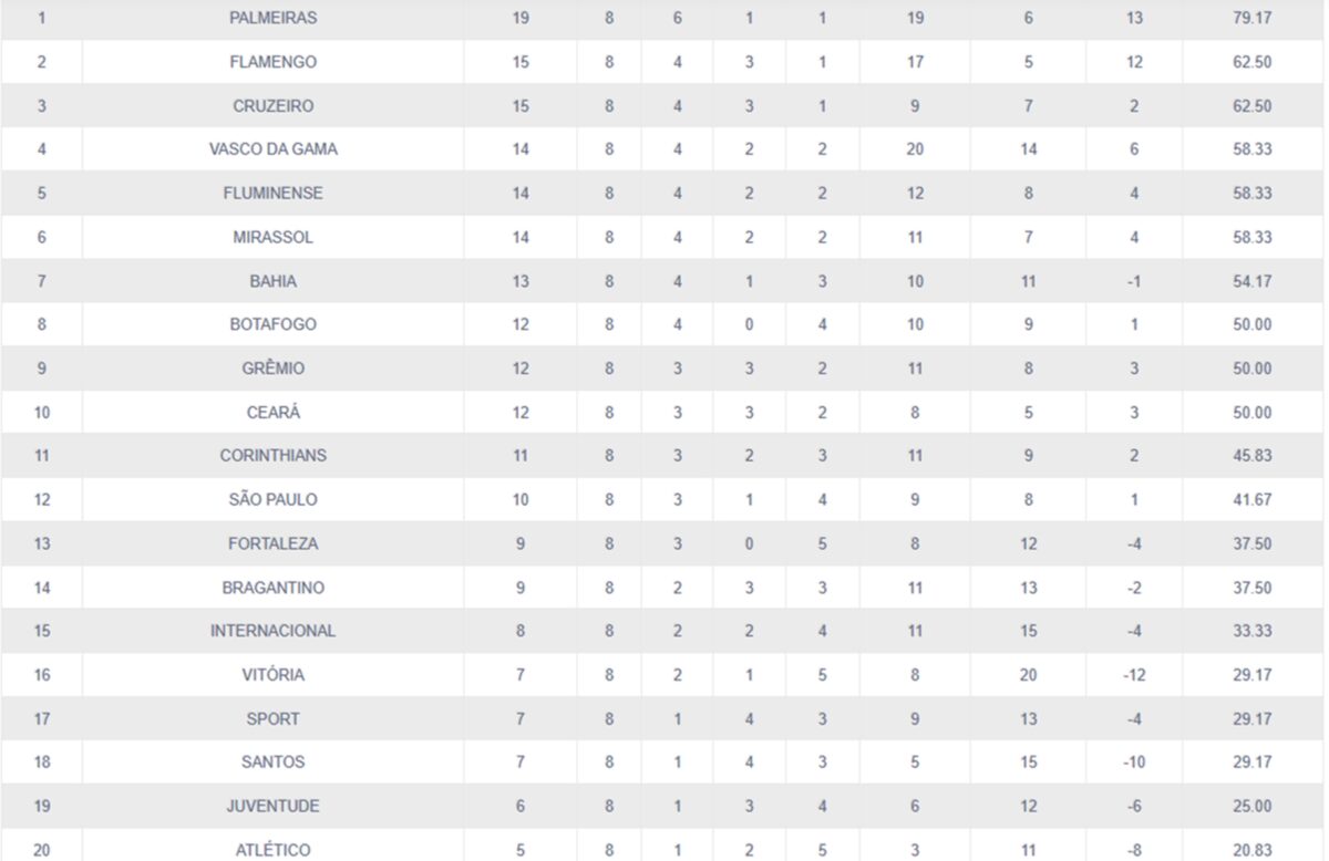 Flamengo e Cruzeiro vêm logo na sequência, com 15 pontos. Vasco, com 14, fecha o G-4.