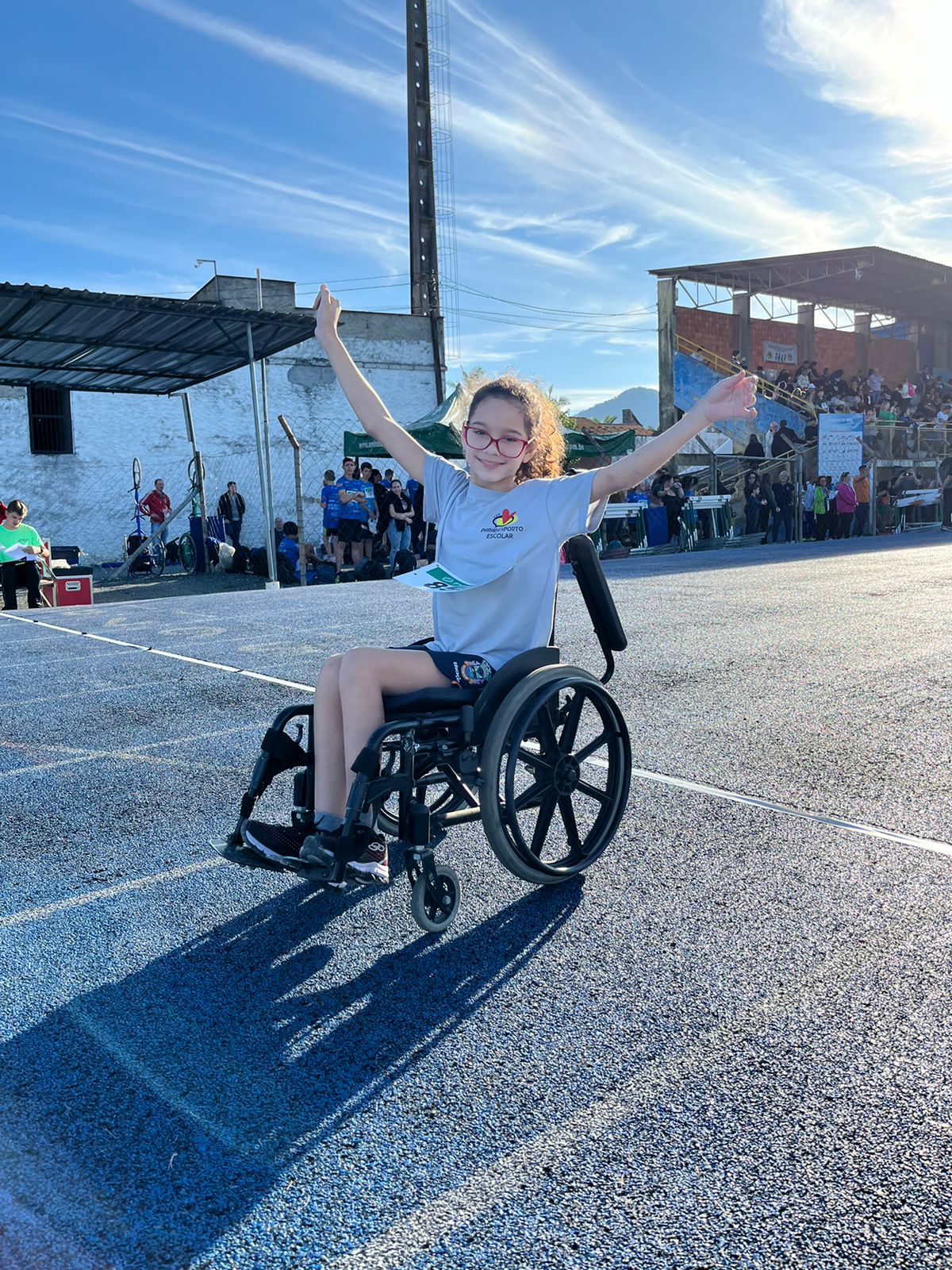 Na programação do dia na pista de atletismo do município de Timbó, a cadeirante Victória Kamilly da Silva viveu um dia inesquecível. Sozinha e guiando a sua cadeira de rodas, atravessou toda a reta principal da pista para ser aplaudida de pé e com o sorriso no rosto levantar os braços e viver um momento muito sonhado por ela própria.