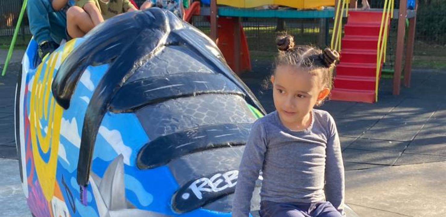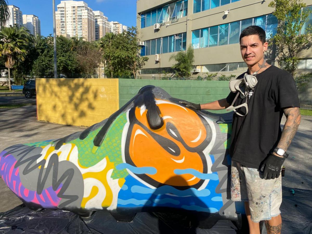 O artista plástico santista Caio Fonseca, o Caio Fonseca Art, de 27 anos, usou uma cartela de cores vibrantes, como roxo, preto, verde, azul, vermelho, amarelo, rosa, entre outros tons para atrair a atenção das crianças. “É muito legal porque a gente consegue colocar a nossa arte num parquinho onde as crianças vão brincar, tirar foto e ter proximidade maior com a arte”.