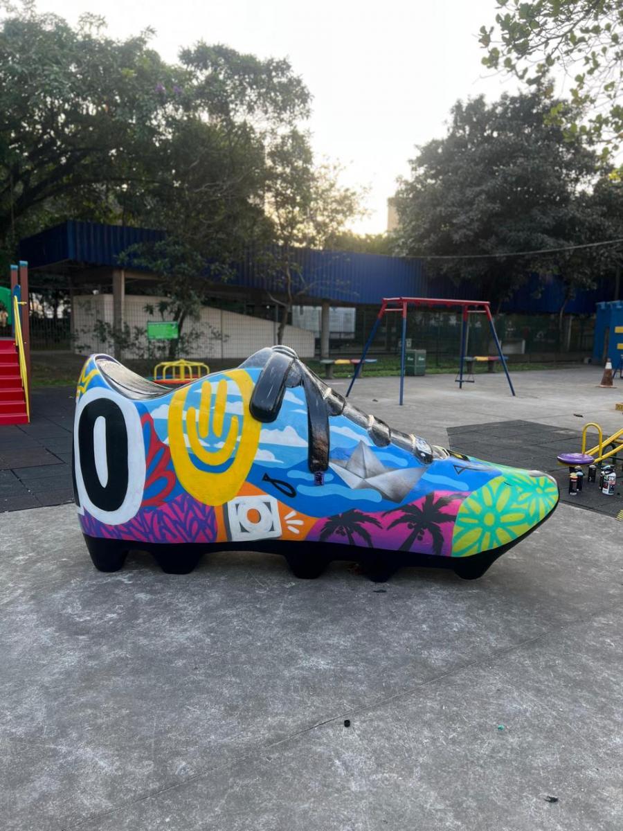 Acostumado com trabalhos de várias dimensões, o santista levou dois dias e 20 latas de tinta acrílica em aerosol, própria para grafite, para pintar a chuteira de 2,50m de comprimento por 1,20m de altura.
