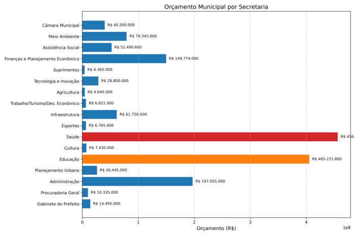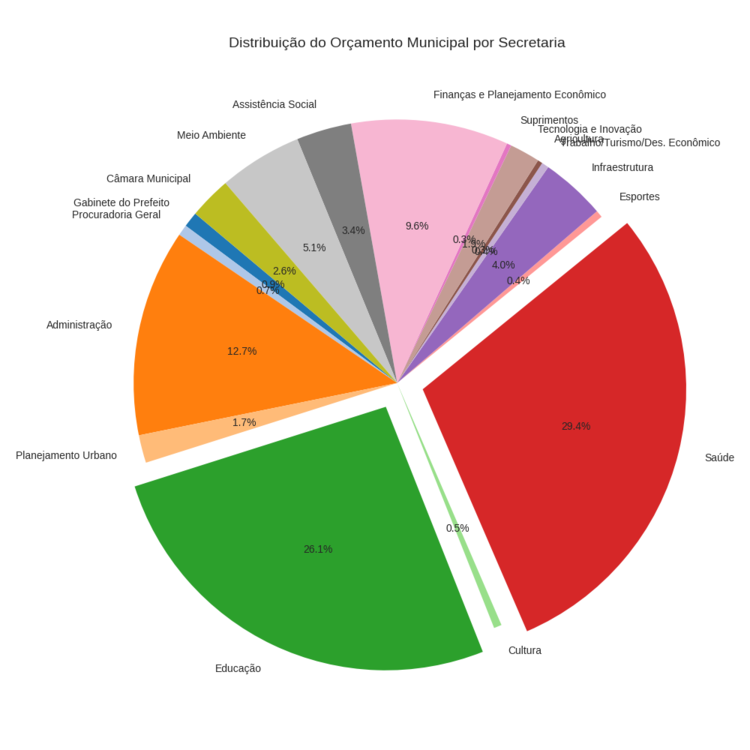 O gráfico de pizza acima mostra a distribuição do orçamento municipal por secretaria, com destaque para Saúde e Educação, que concentram as maiores fatias: