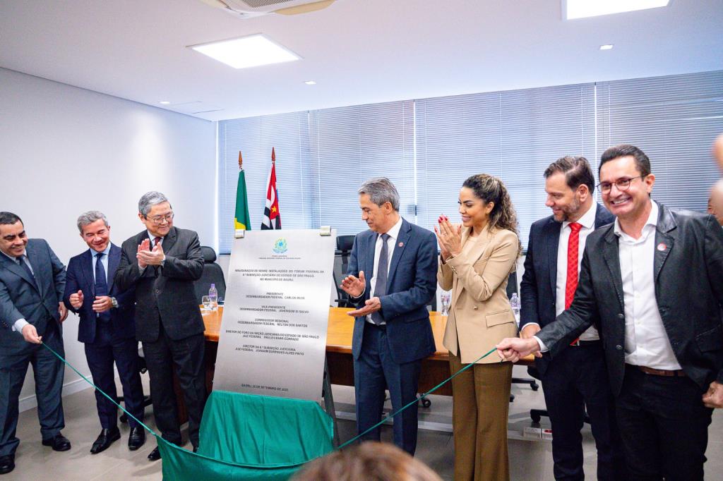 A prefeita Suéllen Rosim participou da inauguração da nova sede da Justiça Federal em Bauru nesta quinta-feira (25). Estiveram presentes no evento o presidente do Tribunal Regional Federal da 3ª Região (TRF-3), desembargador federal Carlos Muta, do diretor do Foro da Seção Judiciária do Estado de São Paulo, juiz federal Paulo Cesar Conrado, e do diretor da 8ª Subseção Judiciária do Estado de São Paulo, juiz federal Joaquim Eurípedes Alves Pinto.