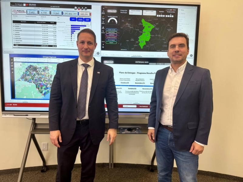 Durante o encontro, o secretário Derrite apresentou ao prefeito Vinicius algumas funcionalidades do programa Muralha Paulista, lançado pelo Governo de São Paulo em 2024.