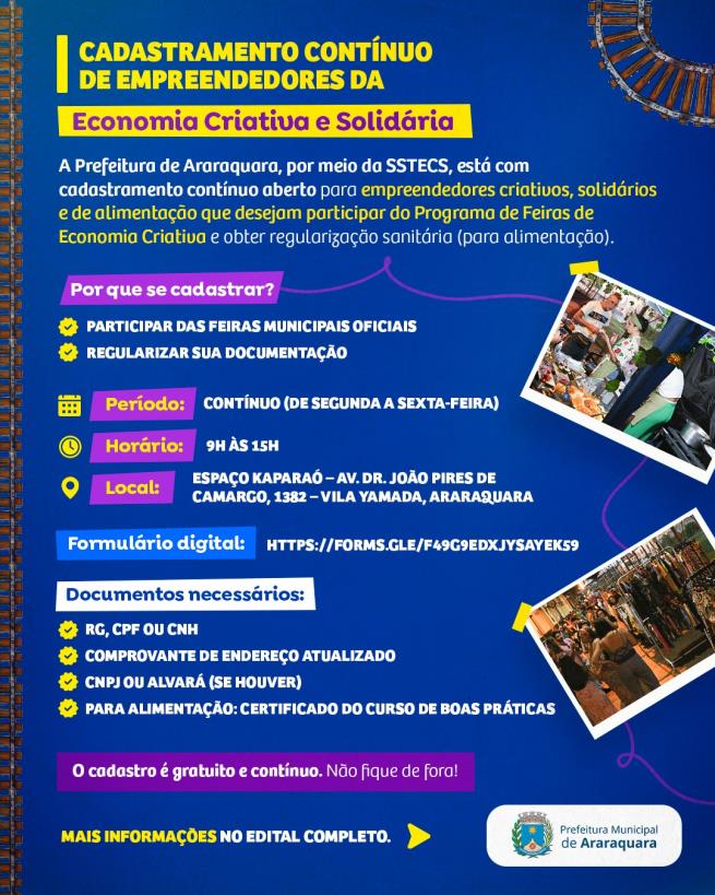 A Prefeitura de Araraquara, por meio da subsecretaria do Trabalho e da Economia Criativa e Solidária da Secretaria Municipal de Desenvolvimento Econômico, lançou edital de chamamento para o cadastramento contínuo de empreendedores. O objetivo é realizar o mapeamento e regularização dos empreendedores criativos, populares e de alimentação para participação no Programa de Feiras de Economia Criativa.