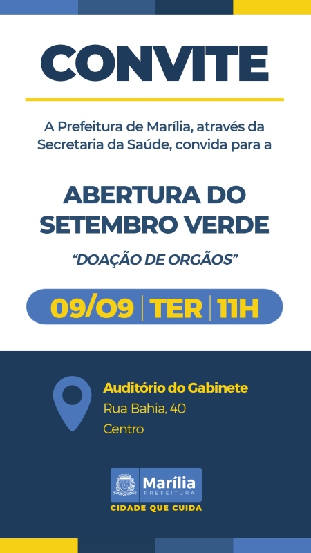 A Prefeitura de Marília, por meio da Secretaria Municipal da Saúde, realizará nesta terça-feira (09), às 11h, no auditório do gabinete (2º andar do Paço Municipal), a abertura oficial da Campanha Setembro Verde, que tem como objetivo principal o incentivo à doação de órgãos.