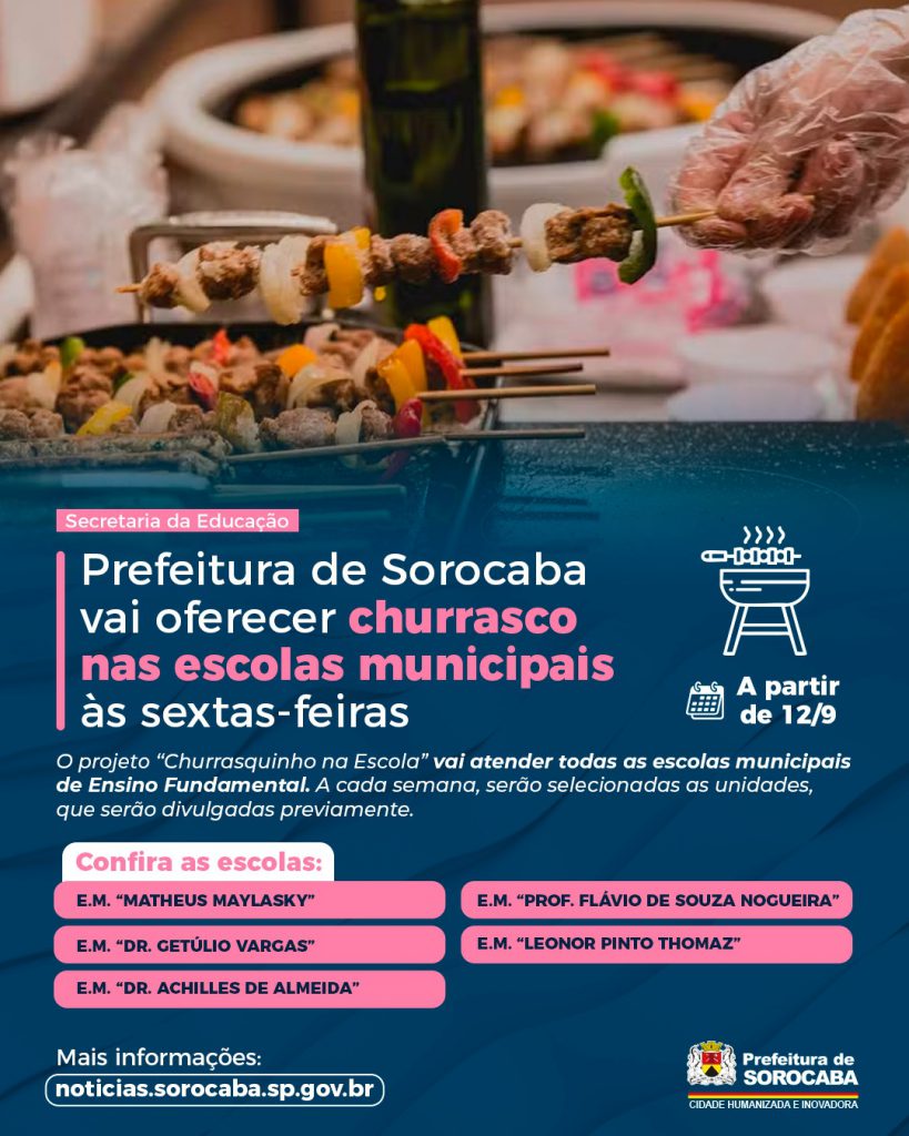 A Prefeitura de Sorocaba, por meio da Secretaria da Educação (Sedu), vai oferecer o projeto “Churrasquinho na Escola”, em parceria com a iniciativa privada. A partir desta sexta-feira (12), alunos de escolas municipais da cidade receberão na merenda um dos pratos mais apreciados pelas famílias brasileiras.