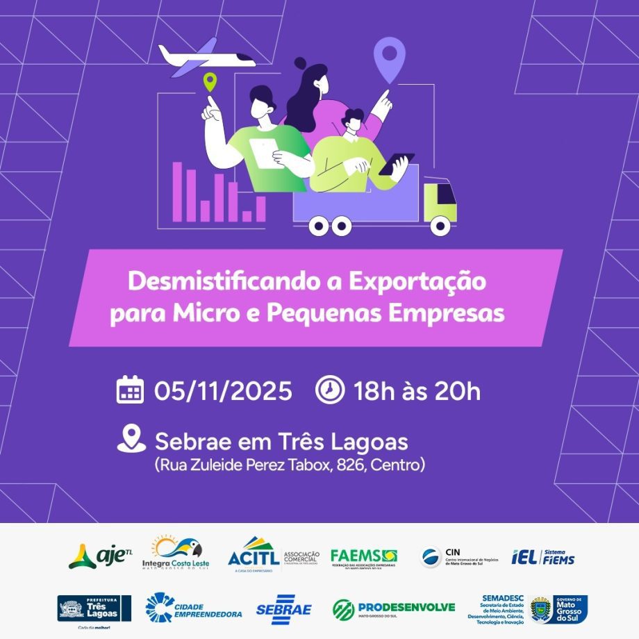 A Prefeitura de Três Lagoas, por meio da Secretaria Municipal de Desenvolvimento Econômico, Ciência, Tecnologia e Turismo (SEDECT) é parceira do SEBRAE no workshop “De Pequeno a Global: Desmistificando a Exportação para Micro e Pequenas Empresas”, que será realizado nesta quarta-feira, 05 de novembro de 2025, às 18h, no SEBRAE Costa Leste, localizado na Rua Zuleide Perez Tabox – 826 – Centro.